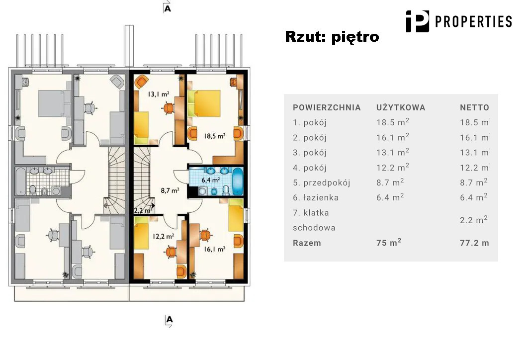 PIĘTRO: 4 przestronne, pełnowymiarowe sypialnie (od 12 m² do 18,45 m²), główna łazienka (5,42 m²).