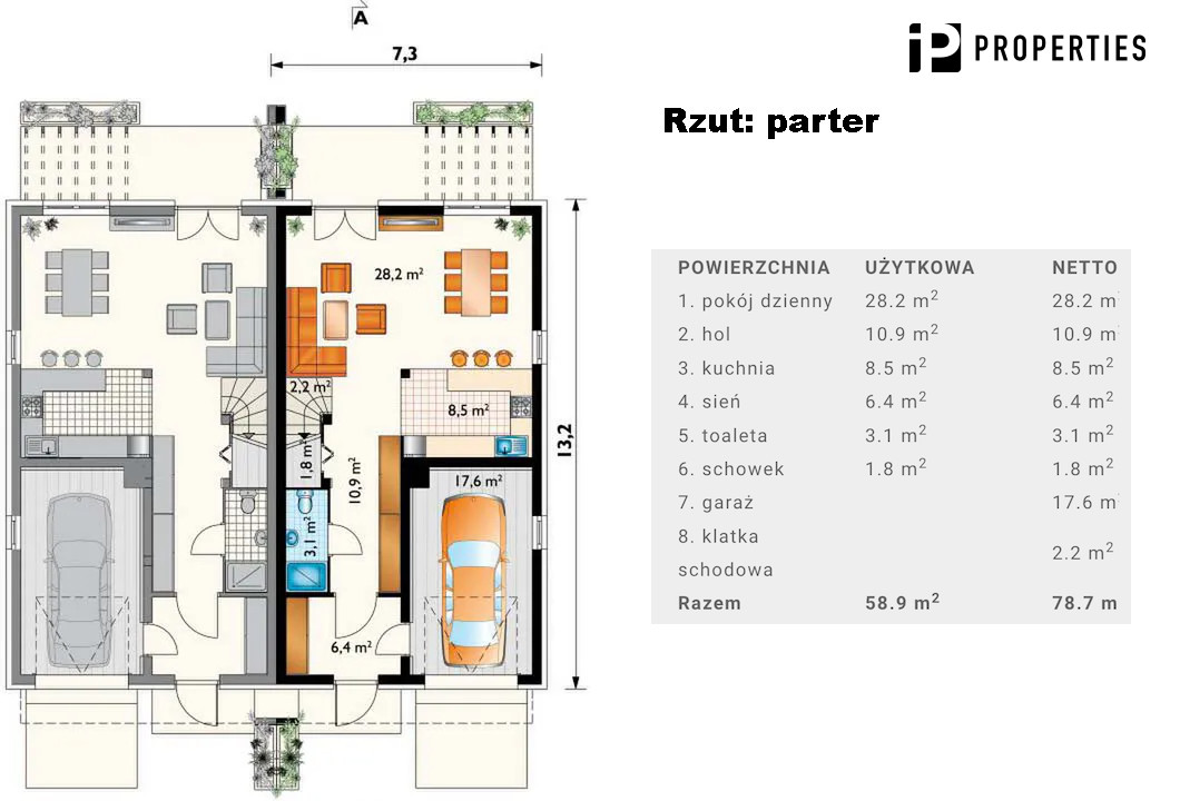 PARTER: Przestronna strefa dzienna o pow. blisko 40 m² (salon z otwartą kuchnią) z dużymi oknami i bezpośrednim wyjściem do ogrodu, łazienka (3,08 m²), przedsionek, komunikacja oraz garaż.