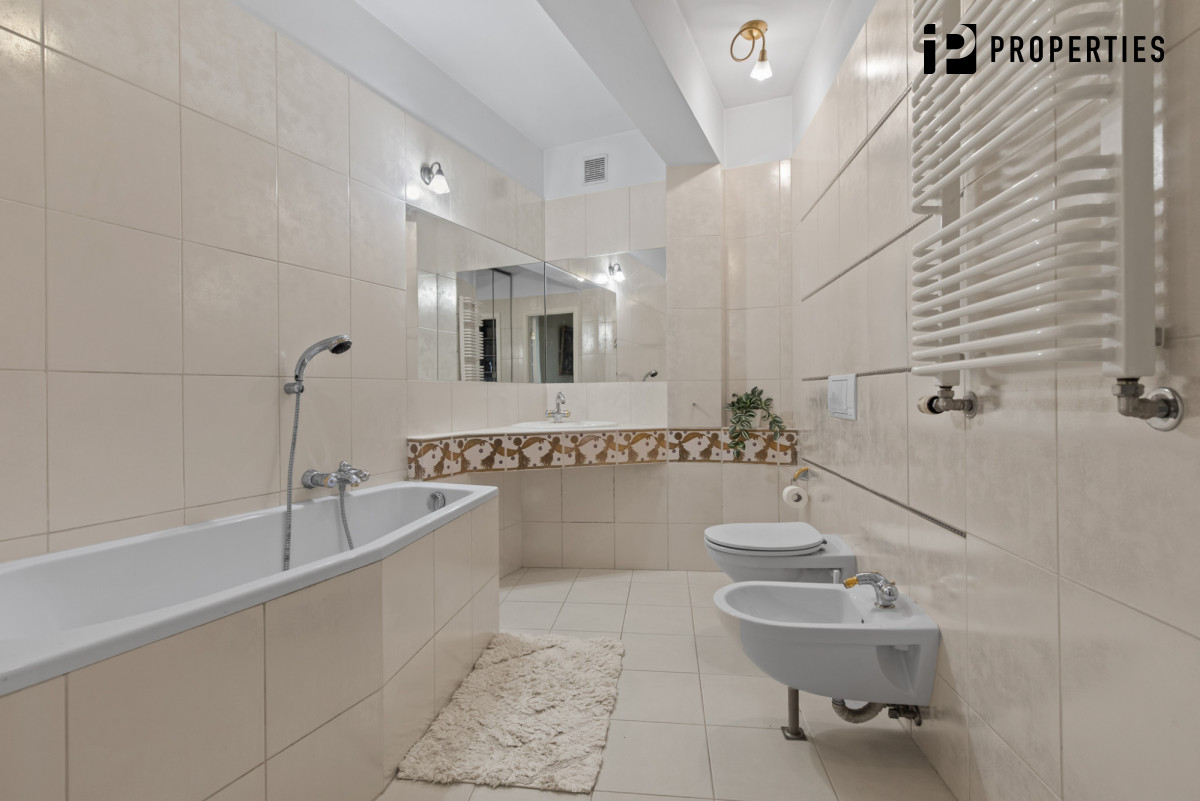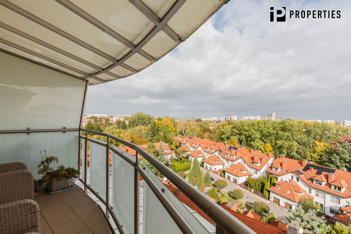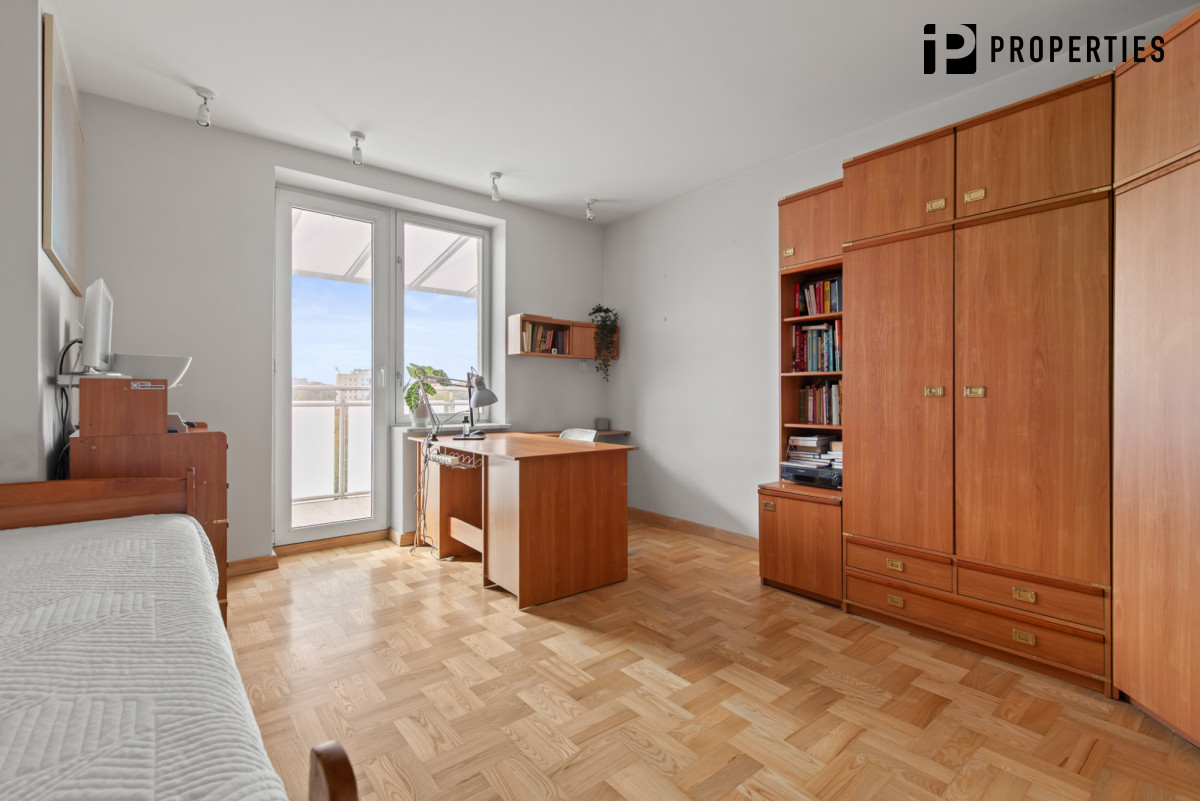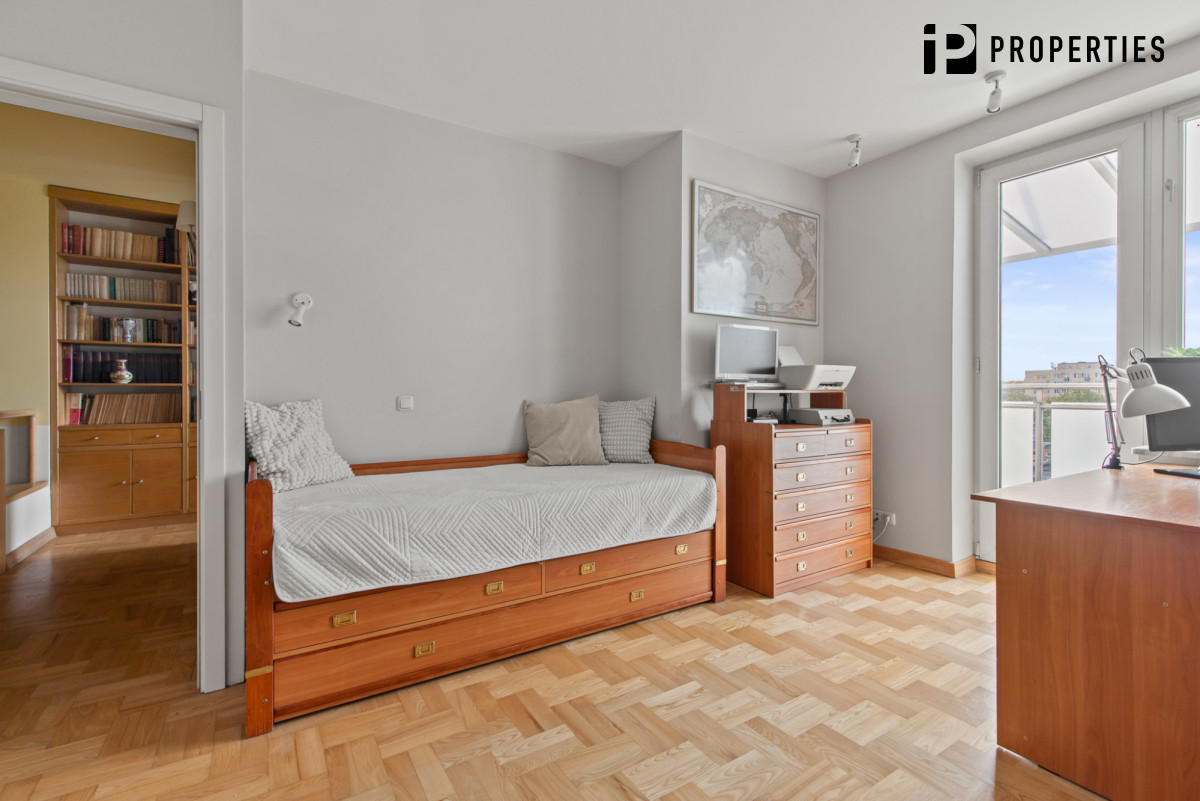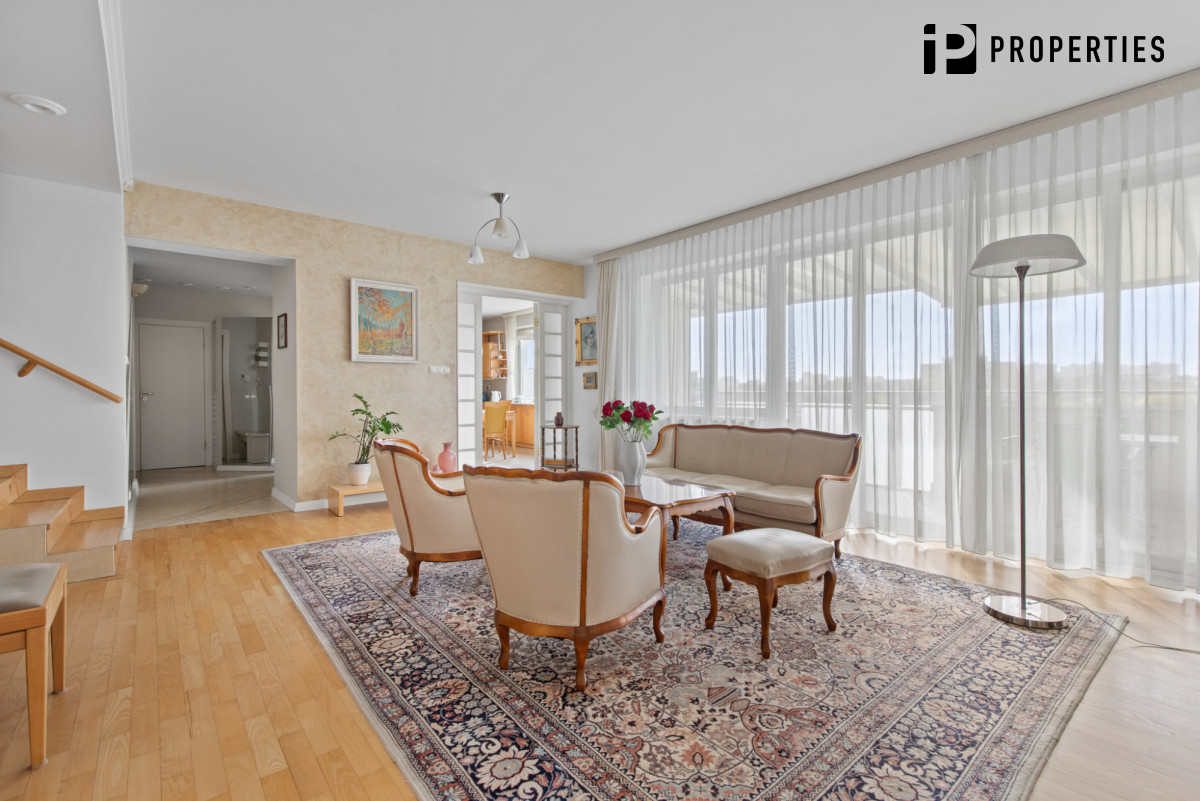 Na pierwszym poziomie znajdziemy 35 metrowy salon z kominkiem, dużą, jasną kuchnię, oba pomieszczenia doskonale doświetlone z wyjściem na 14 metrowy taras z widokiem na otwartą przestrzeń od południowego zachodu. Ponadto przestronny hol z pojemnymi szafami, WC oraz pralnię. Na drugim poziomie znajdują się 3 pokoje oraz 2 łazienki w tym jedna bezpośrednio przynależąca do dużej, 24 metrowej sypialni z wyjściem na 5 metrowy balkon skąd rozciąga się panoramiczny widok na Warszawę. Dwustronna ekspozycja północny - wschód / południowy - zachód. Wysokość pomieszczeń na poziomie I 272 cm, na poziomie II 260 cm. Mieszkanie wyposażone w klimatyzację.