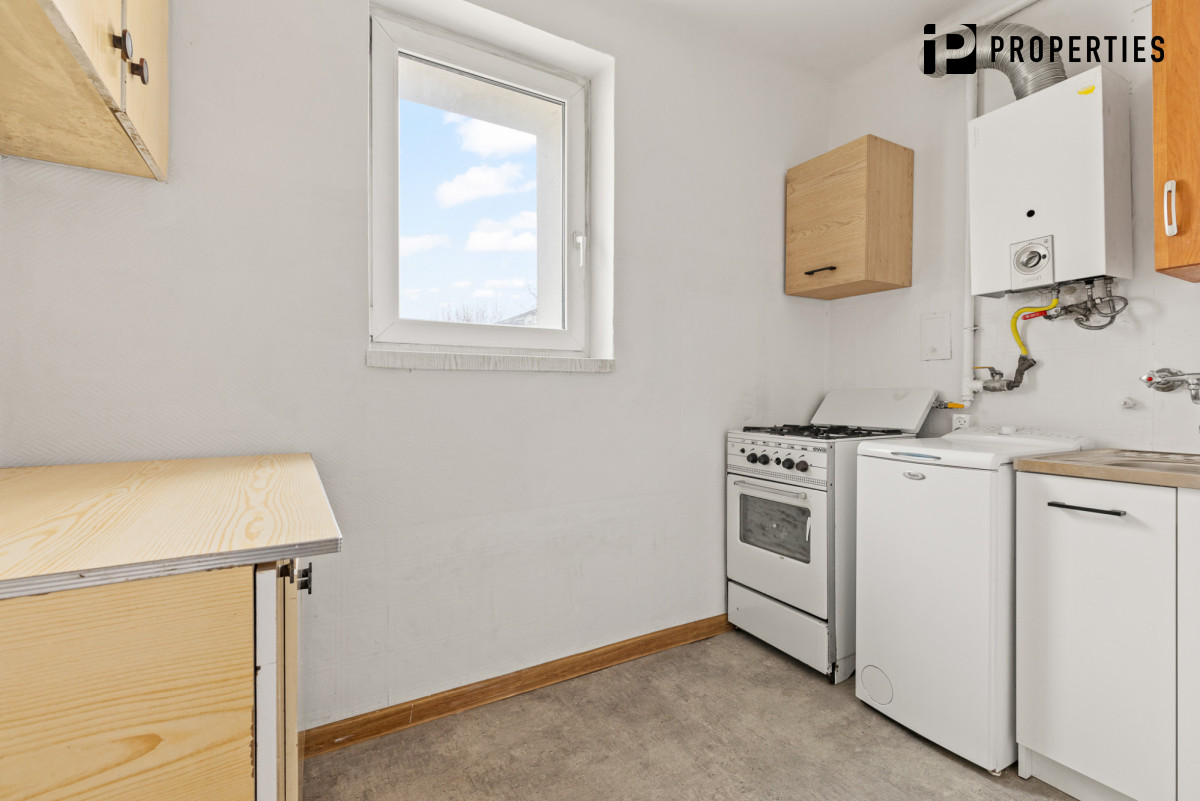 Mieszkanie odświeżone, ale bez mebli ruchomych. W kuchni kuchenka gazowa z piekarnikiem i lodówka.